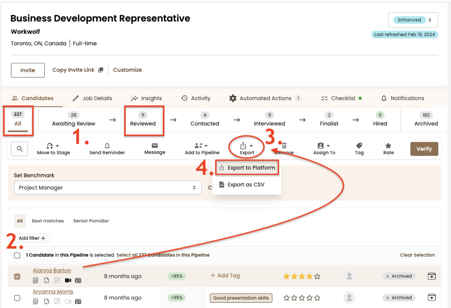 You can export selected Candidates from a Workwolf Pipeline to Lever. This function is only available in the All or Review stages in Workwolf.